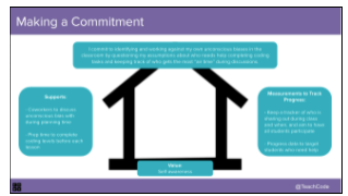 - Commitment: I commit to identifying and working against my own unconscious biases in the classroom by questioning my assumptions about who needs help completing coding tasks and keeping track of who gets the most “air time” during discussions.